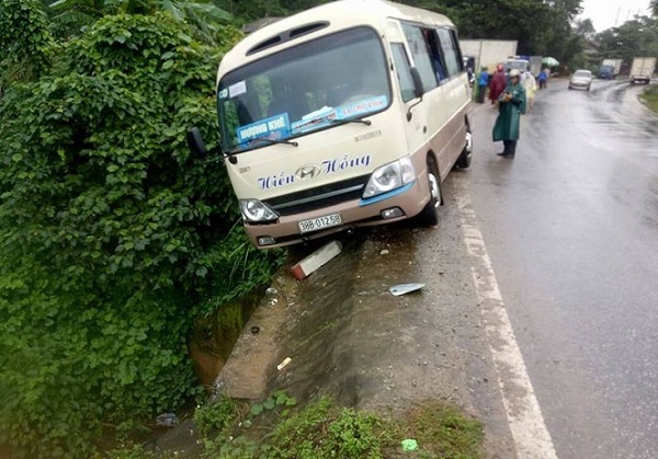 Sợ xe đâm vào vách núi, tài xế xe khách buộc phải đánh lái cho xe đâm vào dãy cột mốc bên đường rồi dừng lại bên vực sâu.