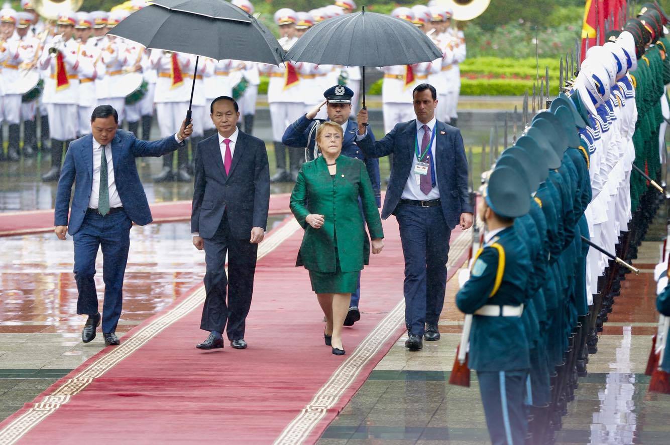 Chủ tịch nước Trần Đại Quang chủ trì lễ đón Tổng thống Chile Michelle Bachelet. Tổng thống Chile có chuyến thăm cấp nhà nước đến Việt Nam trước khi vào Đà Nẵng tham dự hội nghị lãnh đạo các nền kinh tế thành viên APEC.