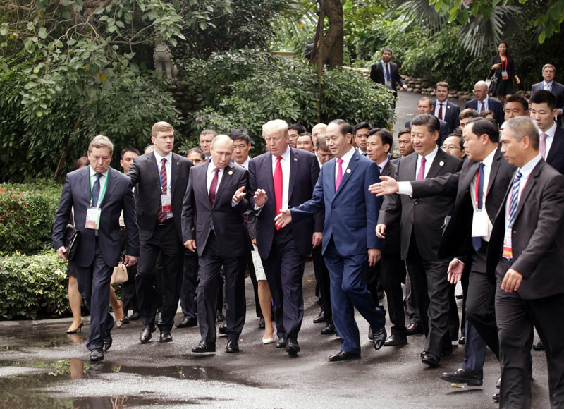 | Chủ tịch nước Trần Đại Quang, Chủ tịch Trung Quốc Tập Cận Bình, Tổng thống Nga V. Putin và Tổng thống Hoa Kỳ Donald Trump trò chuyện vui vẻ trên đường tới khu vực chụp ảnh chung. Ảnh: VGP |