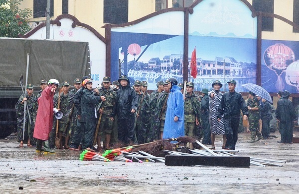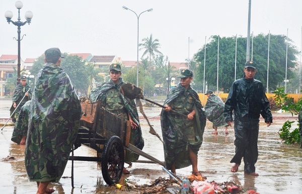 Từ trưa 8/11, gần 500 cán bộ chiến sĩ Quân khu 5 phối hợp lực lượng của Tỉnh đội Quảng Nam, Bộ đội biên phòng và Công an Quảng Nam đã về hỗ trợ Hội An dọn lũ.