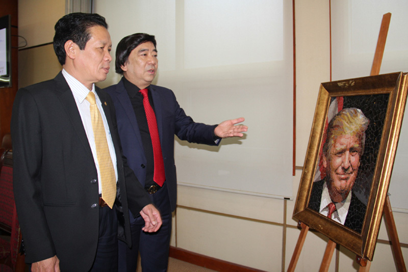 | Thứ trưởng Hoàng Vĩnh Bảo xem bức ảnh chân dung Tổng thống Mỹ Donald Trump. Ảnh: Bộ TT&TT |