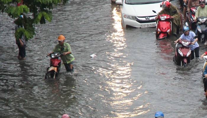 Khoảng 17h chiều, mưa lớn kết hợp với triều cường dâng cao khiến nhiều tuyến đường thuộc quận 7, Nhà Bè, Bình Chánh ngập nặng từ 0,5-1 m như đường như Huỳnh Tấn Phát, Trần Xuân Soạn, Lê Văn Lương.