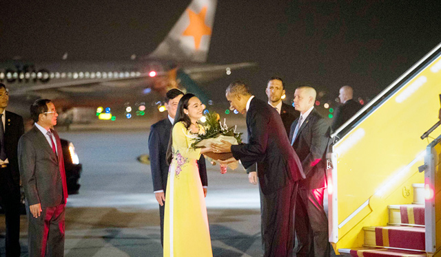 21h30 tối qua, Tổng thống Mỹ Barack Obama đã hạ cánh xuống sân bay Nội Bài và có mặt tại khách sạn Marriott lúc 22h05, bắt đầu chuyến thăm chính thức Việt Nam.
