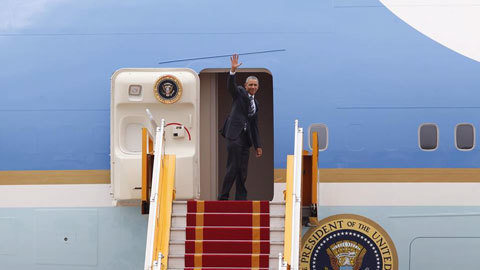 Tổng thống Mỹ Barack Obama tươi cười vẫy chào bước từ chuyên cơ Air Force One xuống sân bay.