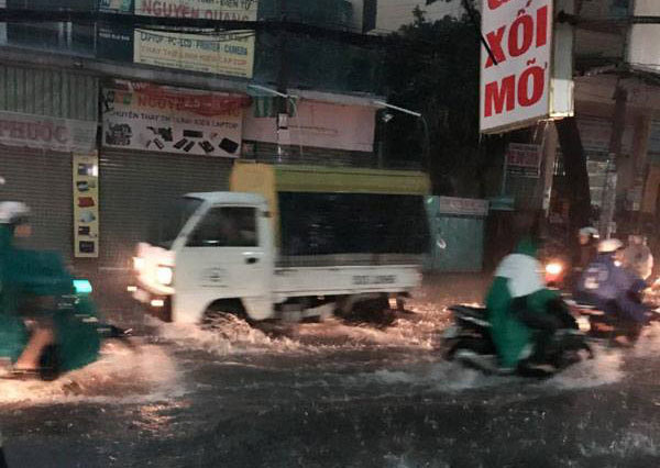 16h, mưa lớn đổ xuống quận 12, quận Gò Vấp, Tân Bình, Tân Phú... Khoảng 30 phút sau, các tuyến đường ngập nước hơn nửa mét. Xe cộ chết máy hàng loạt phải dẫn bộ bì bõm.