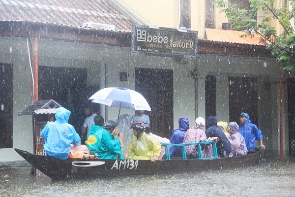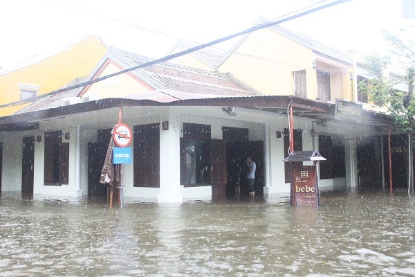Lúc 4h sáng nay, mực nước sông Thu Bồn tại Hội An đã ở mức 1,72m, dưới báo động 3 0,28m. Mưa xối xả suốt buổi sáng cùng với nước lũ từ thượng nguồn đổ về khiến mực nước ở Hội An lên rất nhanh.