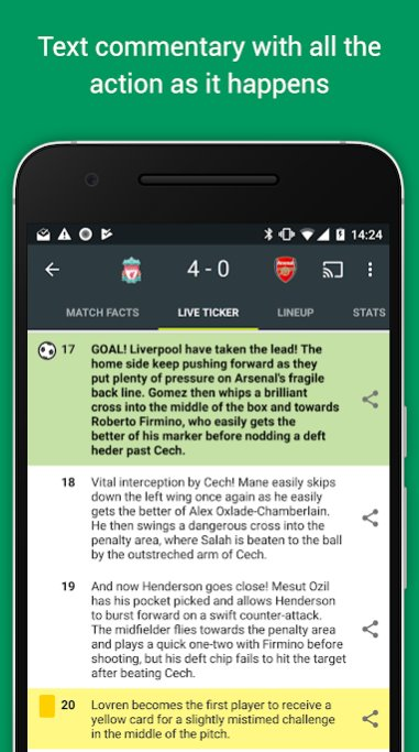 Đây sẽ là một ứng dụng hướng dẫn hoàn hảo cho bạn về mọi thứ từ kết quả trận đấu trong thời gian thực, lịch trình trận đấu, các sự kiện chính thức, bảng biểu và thậm chí là nhận thông báo đẩy khi vừa trận đấu vừa bắt đầu hoặc có bàn thắng vừa được ghi. Ngoài ra bạn có thể chọn các trận đấu mà mình yêu thích nếu như chỉ muốn nhận mỗi thông báo từ các trận này.