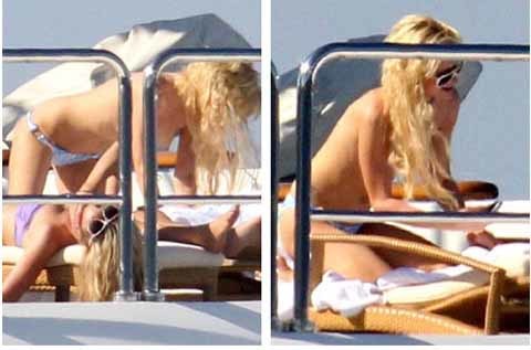 chiếc “quần tam giác” bé tí xíu. Khi đi lại trên du thuyền và gặp bạn bè, cô chỉ