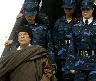Tổng thống Libya có một đội ngũ nữ bảo vệ gồm 40 cô gái xinh đẹp mặc quân phục màu xanh, đội mũ nồi đỏ. Đi tới đâu, thăm nước nào ông Kaddafi cũng mang theo đội nữ binh này.