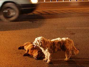 Bất chấp tiếng còi xe và những âm thanh đáng sợ của đường phố, chú chó nhỏ màu vàng vẫn đứng bên xác bạn. Sự việc xảy ra từ hôm thứ Hai 21/2. Người bạn 4 chân của chú chó trung nghĩa này đã bị đánh trên đường Dazhi và chết vì vết thương của mình.