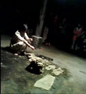 Hành động này được lặp đi lặp lại nhiều lần, nữ nghệ sĩ tiếp tục vắt những miếng bóng cho kiệt nước, rồi lại là hết mặt này đến mặt kia của chúng. Khiến người xem giật mình nhất là lúc người đàn bà này đắp từng miếng bóng lợn lên mặt, lên tay… và lấy bàn là là đi là lại. Khán giả có thể thấy khói bốc lên nghi ngút và nghe những tiếng xèo xèo của vết cháy.
