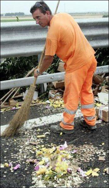 Ngày 5/7/2010, một chiếc tải lớn mang theo 2 triệu euro trong thùng xe bỗng nhiên lật nhào. Toàn bộ số tiền xu mệnh giá 1 euro và 2 euro rải suốt một đoạn đường dài, trước khi cảnh sát tới, người đi đường đã kịp cuỗm đi khoảng 50.000 euro. Cảnh sát đã phải đóng cửa đoạn đường trên và huy động nhiều nhân viên dùng chổi để quét số tiền này