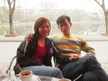 | Nụ cười hạnh phúc của Tình bên vợ sắp cưới. |
