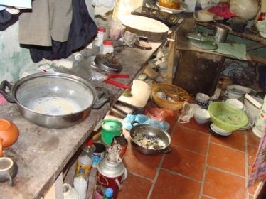 mắc trên giường. Trên đỉnh màn có mấy tấm xốp để hứng mưa dột. Bát đĩa ăn dở la