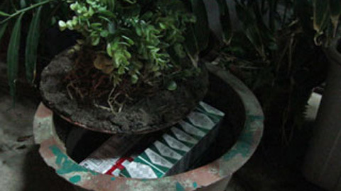 | Thuốc lá được phát hiện giấu dưới chậu hoa trong một đợt truy quét hồi giữa tuần trước của Cảnh sát Singapore (Ảnh: Straits Times) |