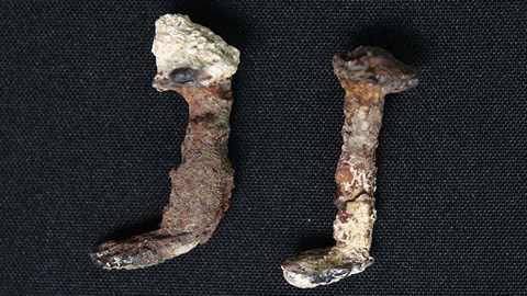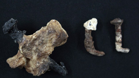 Mảnh xương bị đóng đinh (trái) và hai chiếc đinh được tìm