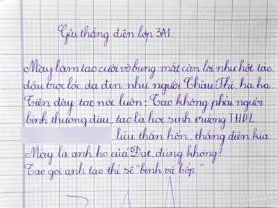 Mày làm tao cười vỡ bụng: mắt cận lòi như hột táo, đầu trọc lóc, da đen như người châu Phi, ha ha. Tiện đây tao nói luôn: Tao không phải người bình thường đâu, tao là học sinh trường THDL (Tiểu học dân lập – PV)... Liệu thần hồn, thằng điên kia.