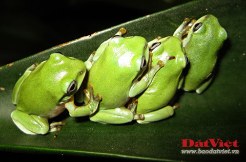 Cảnh tượng hàng trăm chú ếch cây phệ lúc nhúc bám trên những chiếc lá cây.