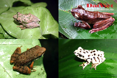Một số loài ếch khác: ếch cây sẩn nhỏ (phía trên bên trái), chẫu chàng Mẫu Sơn (phia dưới bên trái) và ếch cây Trung bộ với hai màu sắc khác nhau (bên phải).