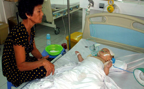 tình trạng bé Quỳnh đang hết sức nguy kịch, nằm bất tỉnh trên giường bệnh.