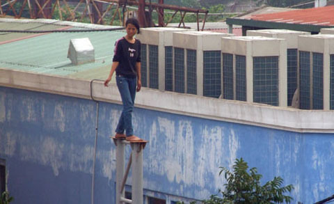 | Cô gái leo lên cột sắt cao hơn 6m vào chiều 22/4 định tự tử (Ảnh: VnMedia) |