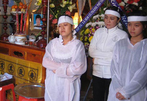 Bà Trần Thúy Liễu cùng 2 con gái trong đám tang chồng - nhà báo Hoàng Hùng (Ảnh: Pháp luật TP.HCM) |