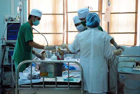 | Các bác sĩ bệnh viên Nhi Thanh Hóa đang tích cực cứu chữa cho cháu Linh |