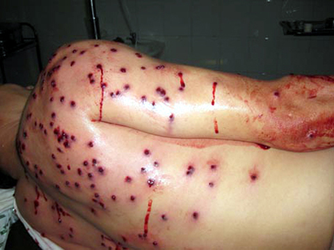 | Lưng ông Hạnh chi chít vết thương đang rỉ máu. (ảnh Bee.net.vn) |