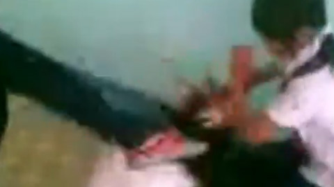 | Khi bị đánh gục, bạn nữ còn bị 3 bạn cùng lớp xông vào xé áo, lộ cả vòng 1 (Ảnh chụp từ clip) |