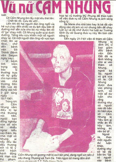 Theo đó, phu nhân trung tá thuê hai tên giang hồ máu mặt, với giá 2 lượng vàng. Ngày định mệnh 18/7/1963, khi Cẩm Nhung xuất hiện trên phố, kẻ thủ ác đã tạt thẳng vào mặt cô vũ nữ một ca acid đậm đặc. Lúc đó, theo những người chứng kiến, người đẹp Cẩm Nhung chỉ kịp ôm lấy mặt, thét lên: "Chết tôi rồi. Cứu tôi với!...". Cẩm Nhung quằn quại dưới đường. Tiếng kêu cứu khiến một số người chạy lại. Có một người đàn ông vực nạn nhân lên xe taxi, chở đến bệnh viện Đô Thành (bệnh viện Sài Gòn ngày nay).
