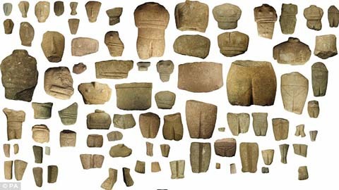 | Bộ sưu tập các bức tượng đã được cố tình đập vỡ khiến các nhà khảo cổ cho rằng đây là dấu tích của một nghi lễ cổ |