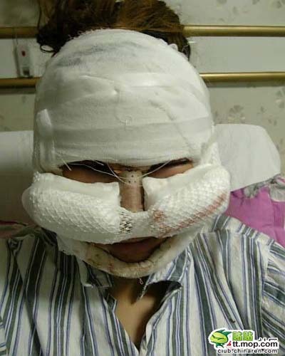 ngay sau khi tiến hành phẫu thuật với băng trắng bịt kín cả khuôn mặt; ảnh trong