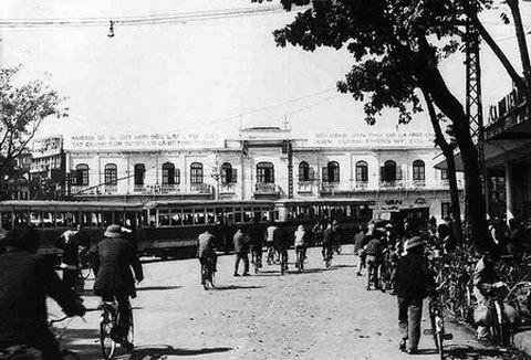 | Tàu điện trên quảng trường Đông Kinh Nghĩa Thục, với bùng binh mà ngày nay là đài phun nước bờ hồ và nhà điều hành xe điện là tòa nhà "Hàm cá mập". |