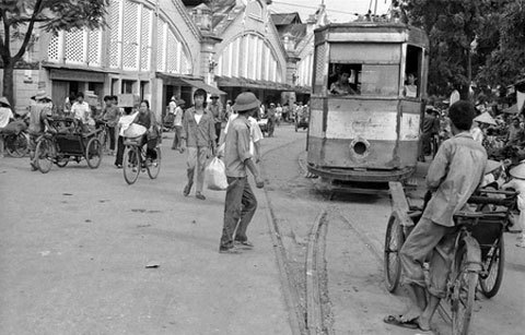 | Tàu điện trước cửa chợ Đồng Xuân, năm 1989. |