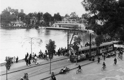 | Tàu điện đi vào bến bờ hồ Hoàn Kiếm, ngày nay đã trở thành bến xe buýt. |