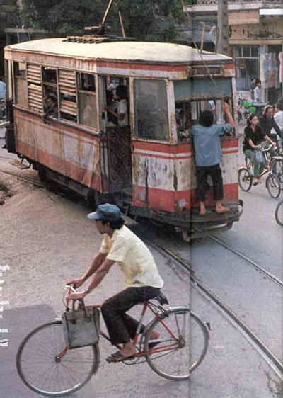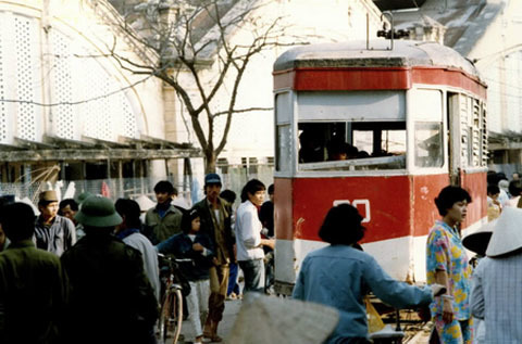 | Tàu điện trên phố Hàng Giấy, 1989. |