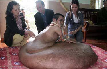 | Anh Nguyễn Duy Hải đang rất khổ sở với khối u hơn 80kg (Ảnh: Bee.net.vn) |