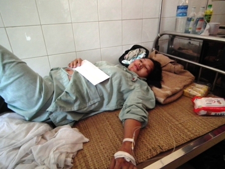 Phía bên phòng đối diện, anh Hải ngồi thẫn thờ nhìn chị Nguyễn Thu Huệ (xã Thủy Xuân Tiên, huyện Chương Mỹ) - vợ anh, đang mang bầu bảy tháng, vừa qua cơn nguy kịch. Hoàn cảnh của anh cũng khá éo le, đang thất nghiệp ở nhà, chị Huệ đang có thai nhưng lại là lao động chính.