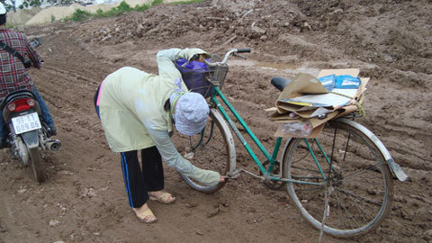 Dắt xe qua nhưng phải dừng lại để cậy đất bám vào lốp xe |