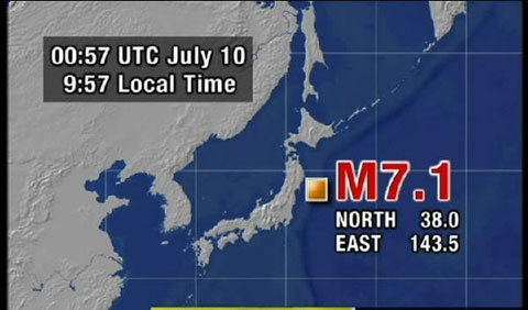 Sáng nay (10/7), một trận động đất mạnh 7,1 độ richter đã làm rung chuyển toàn bộ khu vực Đông bắc Nhật Bản, gây ra sóng thần cao nửa mét tại 3 tỉnh Iwwate, Miyagi và Fukushima.