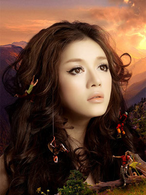 người đàn ông với bộ đồ leo núi đang đu, bám vào mái tóc bồng bềnh của cô. Ánh