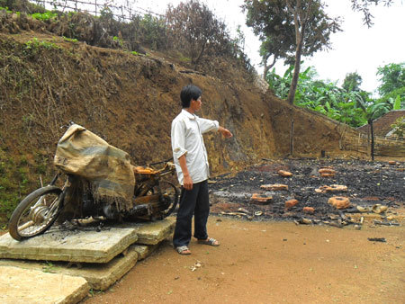 | Ngôi nhà và chiếc xe máy của nạn nhân bị thiêu rụi. |