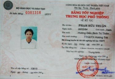 | Bằng tốt nghiệp THPT bổ túc của anh Phạm Hữu Thuận đã được ông Dưng "biến" thành của mình (Ảnh: Dân trí) |