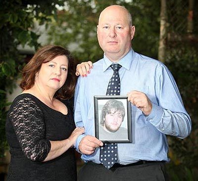 Bố và mẹ kế của Chris Staniforth với di ảnh của cậu (Ảnh: The Sun)