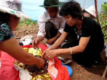 Khi chị H. chỉ chỗ có hài cốt, đoàn tìm mộ tiến hành khai quật ngay. Cô Thuy chỉ