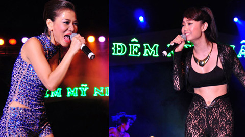 | Ca sĩ Minh Hằng (phải) bị dư luận chỉ trích vì bộ trang phục quá phản cảm trong "Đêm mỹ nhân" |