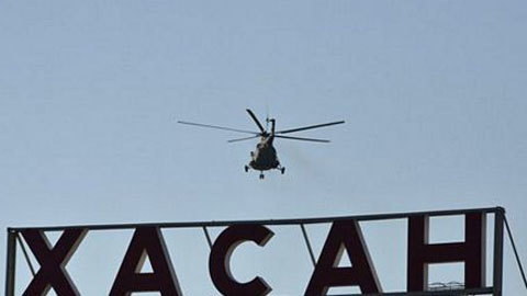 | Một trực thăng Nga bay trên bầu trời ga Khasan. |