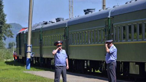 | Các nhân viên Bộ Nội vụ Nga đứng cạnh đoàn tàu của nhà lãnh đạo Triều Tiên. |