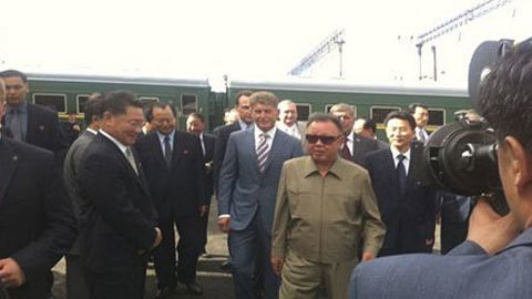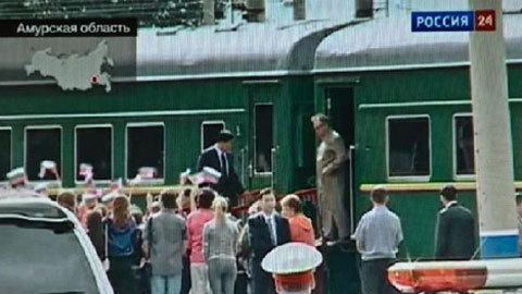 Đoàn tàu bọc thép chở nhà lãnh đạo Triều Tiên Kim Jong-il đến ga Khasan sau khi vượt qua biên giới giữa Triều Tiên và Nga, gần thành phố Vladivostok ở vùng Viễn Đông của Nga hôm 20/8.