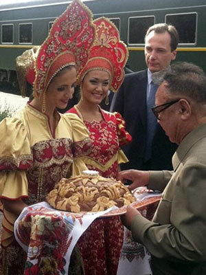 | Các cô gái Nga trong trang phục truyền thống mời ông Kim Jong-il thưởng thức món bánh mì và muối. |